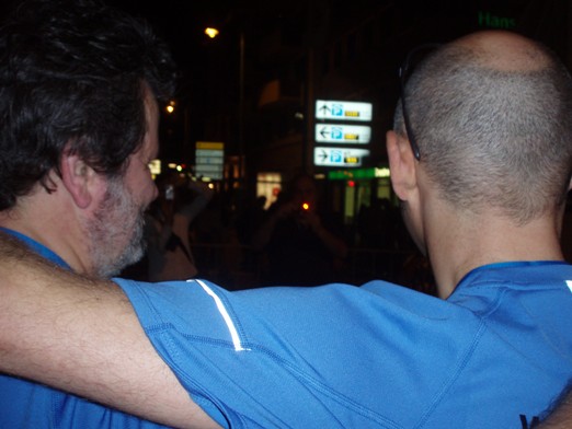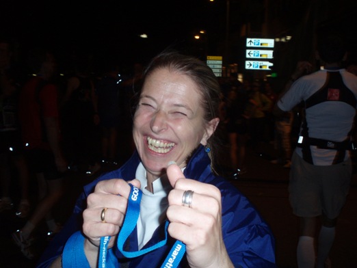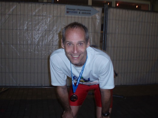 bekomme meine Medaille umgehängt. Ich treffe Helge, der ebenso wie ich
