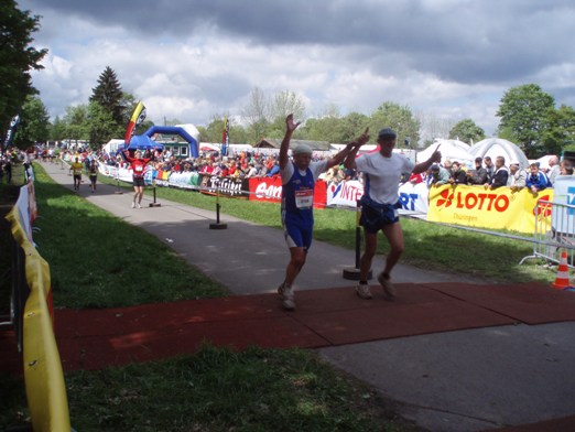 Finisher des Supermarathons, (links einlaufend), die mit dem rot-weißen Band