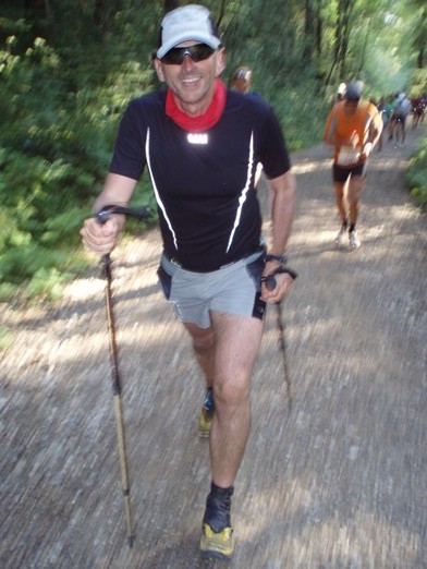 Stöcken gewohnter Läufer mit diesen auf der schwierigen Strecke erhebliche