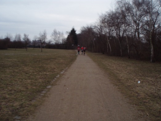 drei machen uns auf den Weg. Spontan springen Läufer von den Bänken auf,