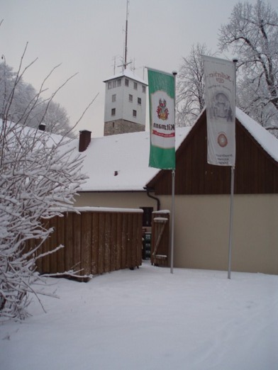 Durch die Bäume schimmert das Dreier-Ensemble aus Turm, Wirtshaus und