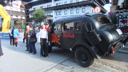 Werbegefährt eines angeblich Flügel verleihenden Getränks. 1 - 2 - 3... wird