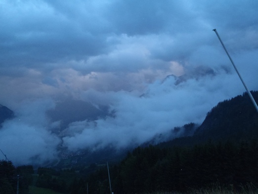 Abendrot genießen, blicke ich jetzt zurück auf ein Wolken verhangenes Tal.