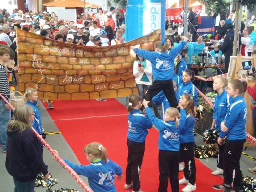 Symbolisch durchbrechen die ersten Starter eine Mauer, zum Glück nur auf
