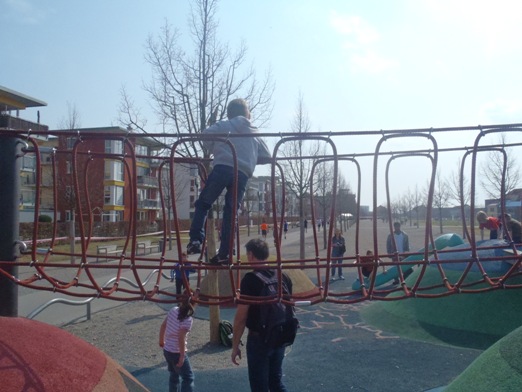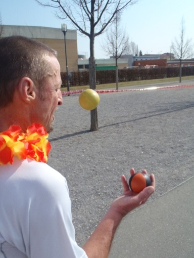 Peter läuft und jongliert gleichzeitig mit 4 Bällen. (Seine