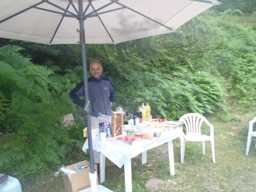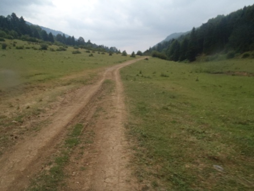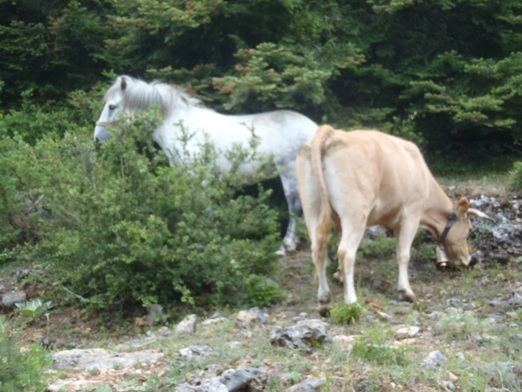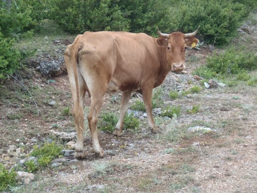 Bergauf-Challenge mit einer Kuh (auf der Kuppe rechts am Weg). Das Tier floh