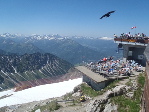 Viele Seilbahn-Touristen in High-Tech-Klamotten besiedeln die Liegestühle.