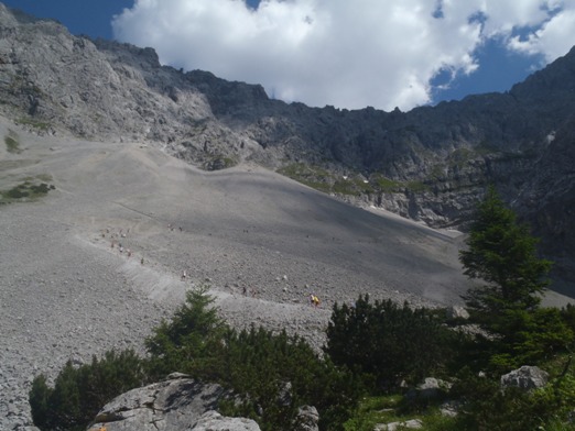des Dammkars. Doch die währt nur kurz, denn das Geröll hier ist lose, steil und