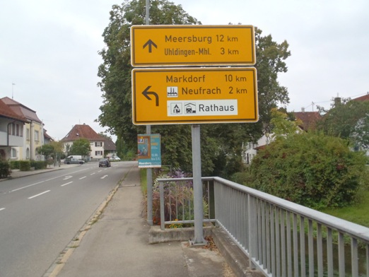auftauchenden Straßenwegweiser. Die ersten Bodenseeorte stehen