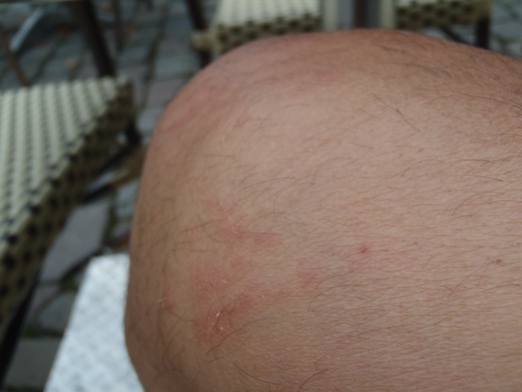Mein Knie: Gezeichnet von nächtlichen Berührungen mit Distel und Nessel.
