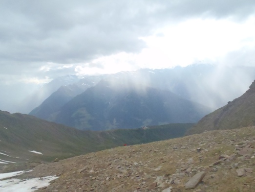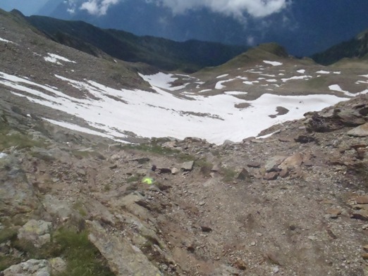 Hinunter aufs Schneefeld und dann in einem weitem Bogen zur Hirzer Hütte.