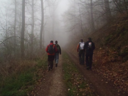 Schon nach wenigen Metern verschwinden wir im dichten Nebel.
